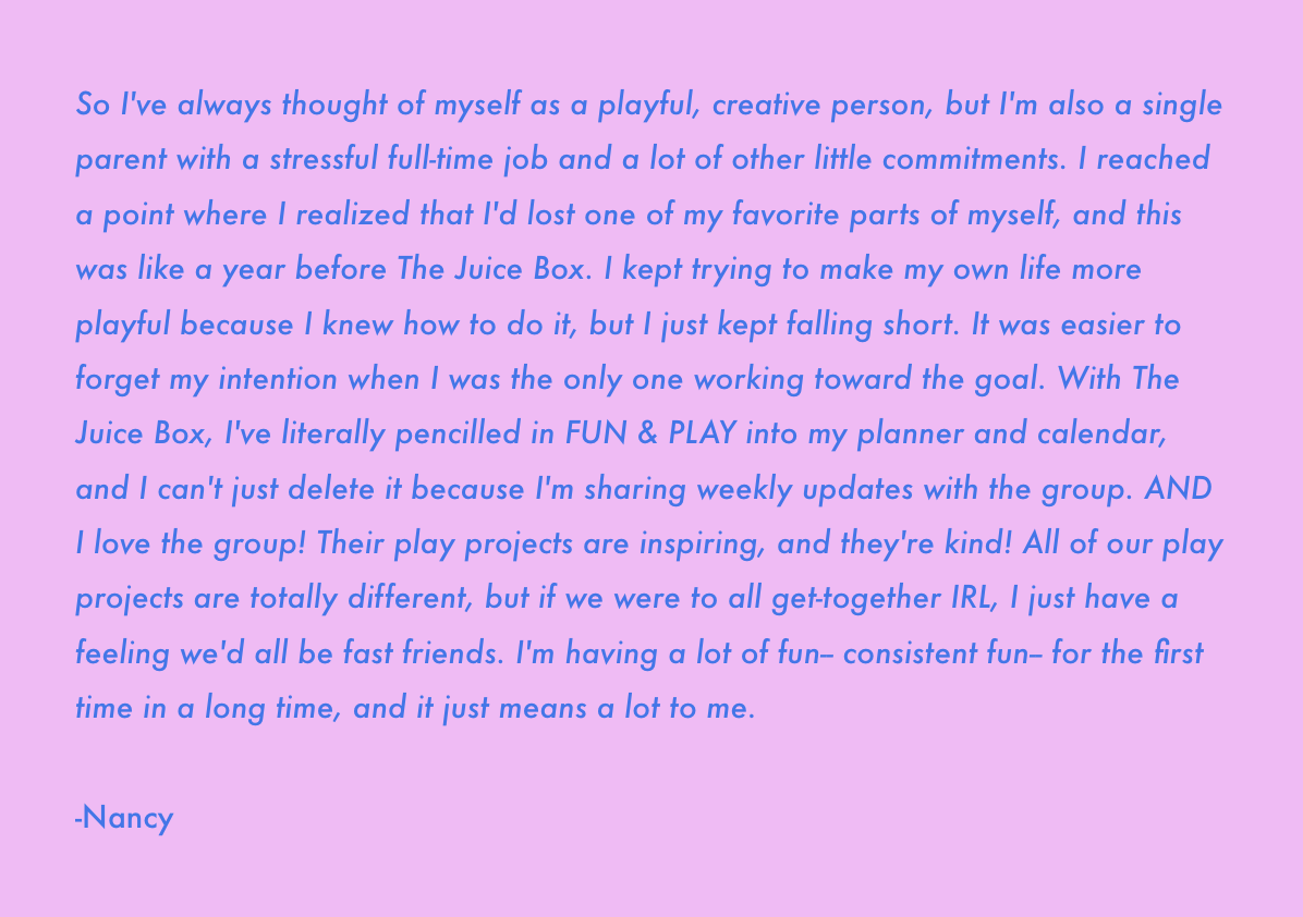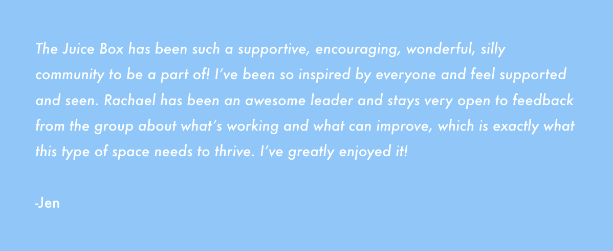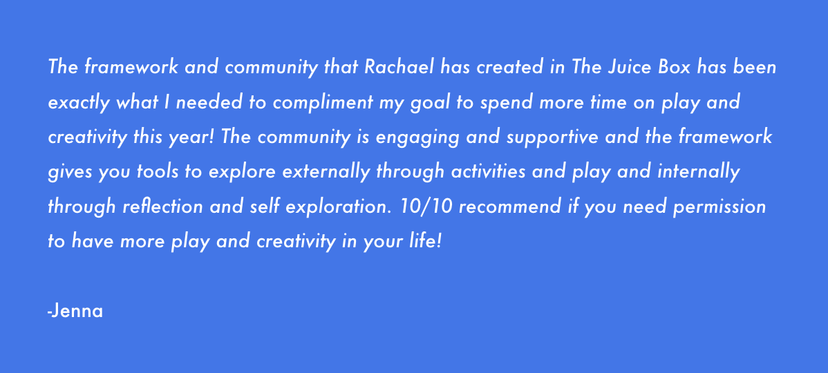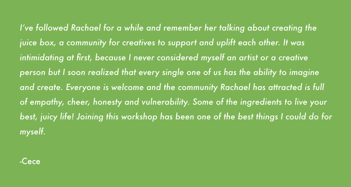 An artist, creativity coach, author, and your internet hype gal. I created this community using the resources that have helped me to build my big, juicy, dream life. My ADHD, chaotic creative brain loves structure, accountability, and the opportunity to chase curiosity and follow the fun. THE JUICE BOX supports all of that.